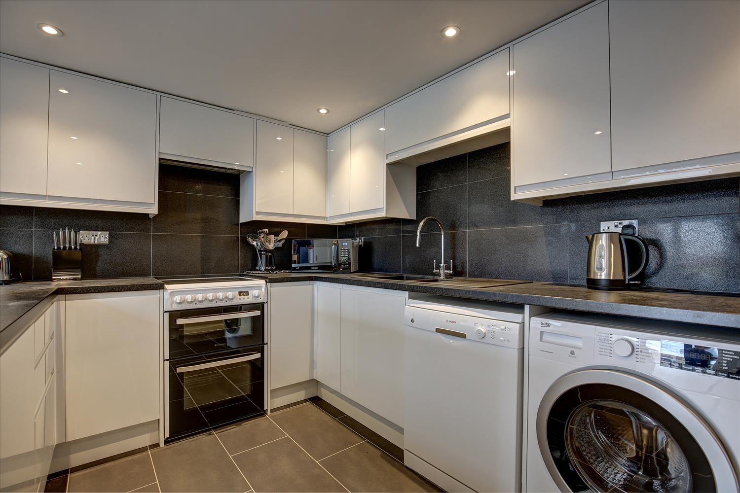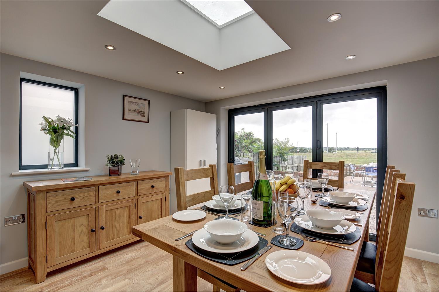 The kitchen diner has a large table and chairs which easily seats 6 and another large smart TV on the wall so adults and children can each have a room for watching their films or radio stations.